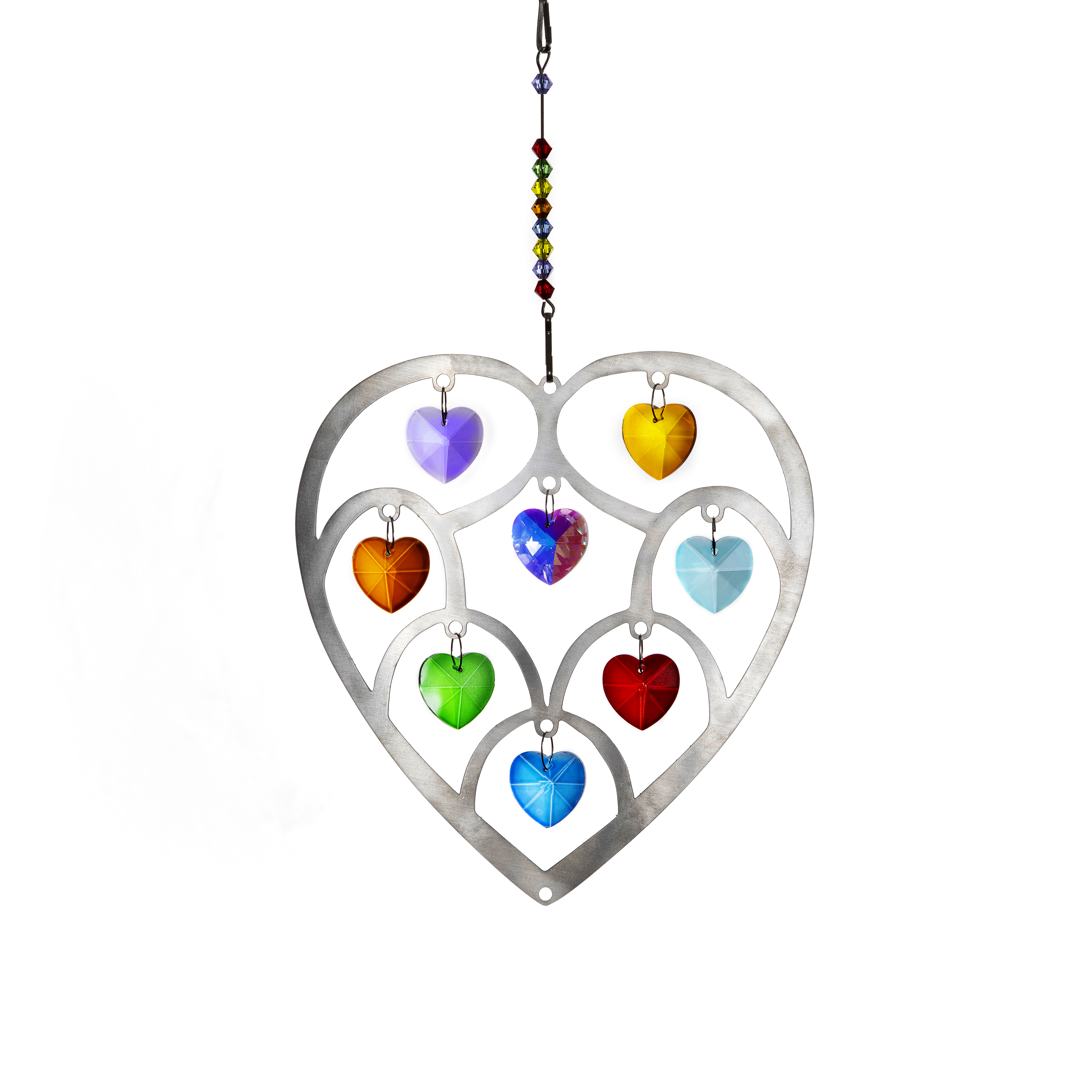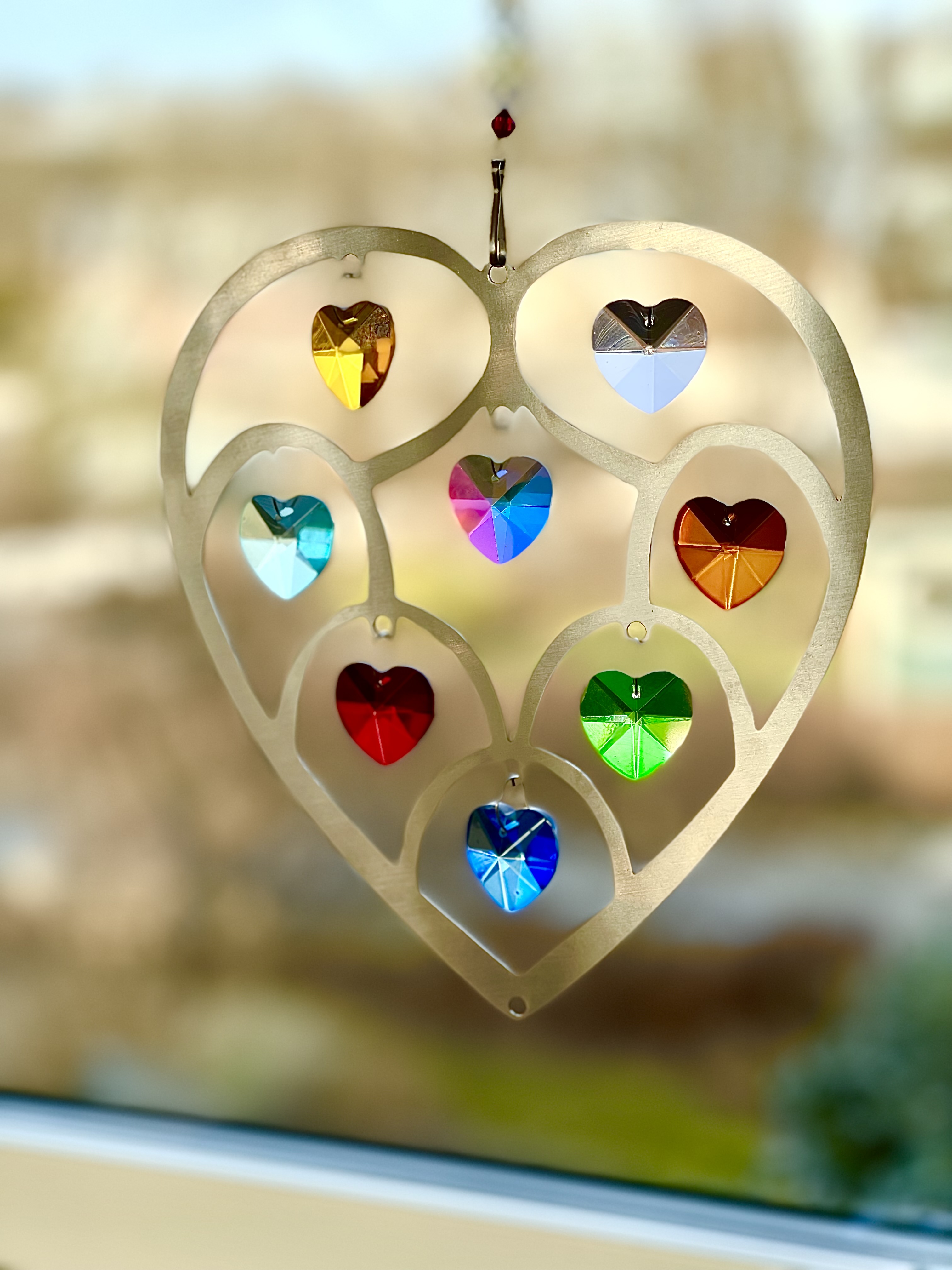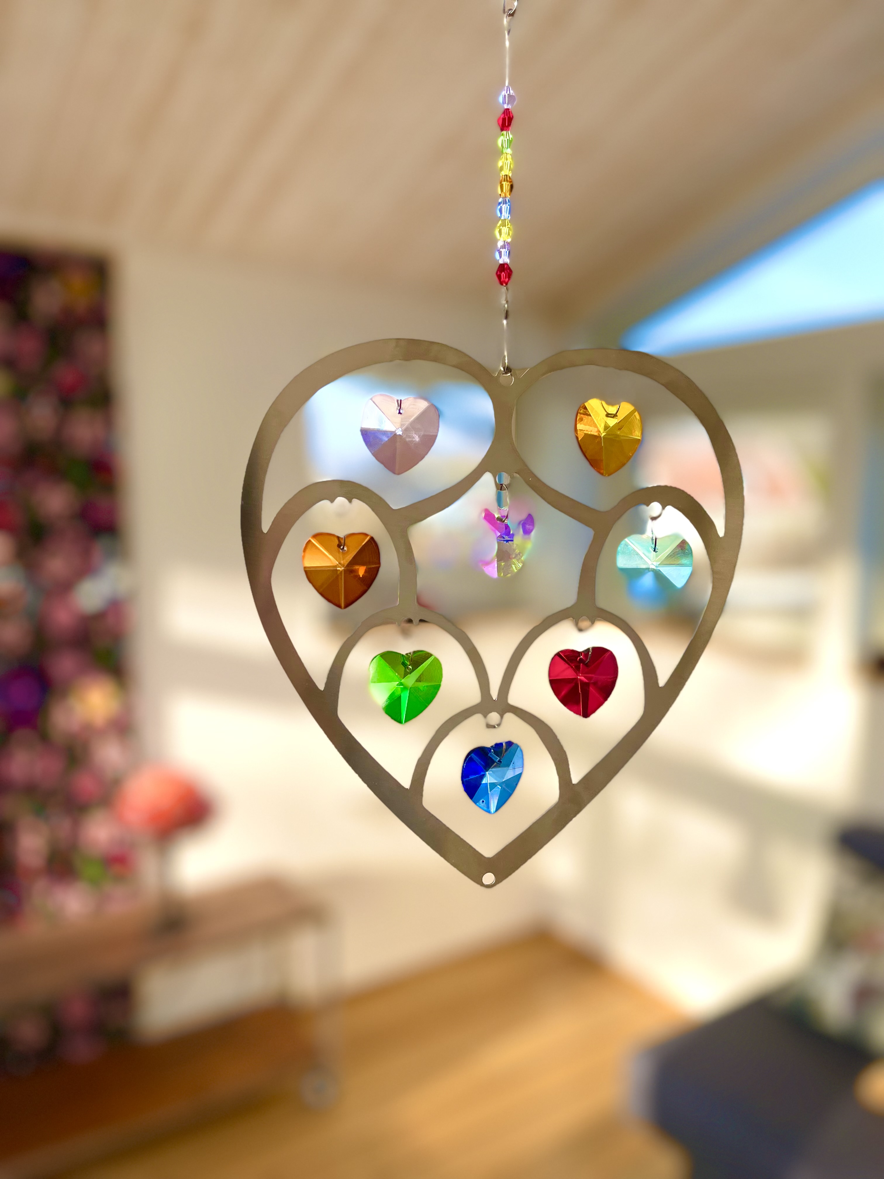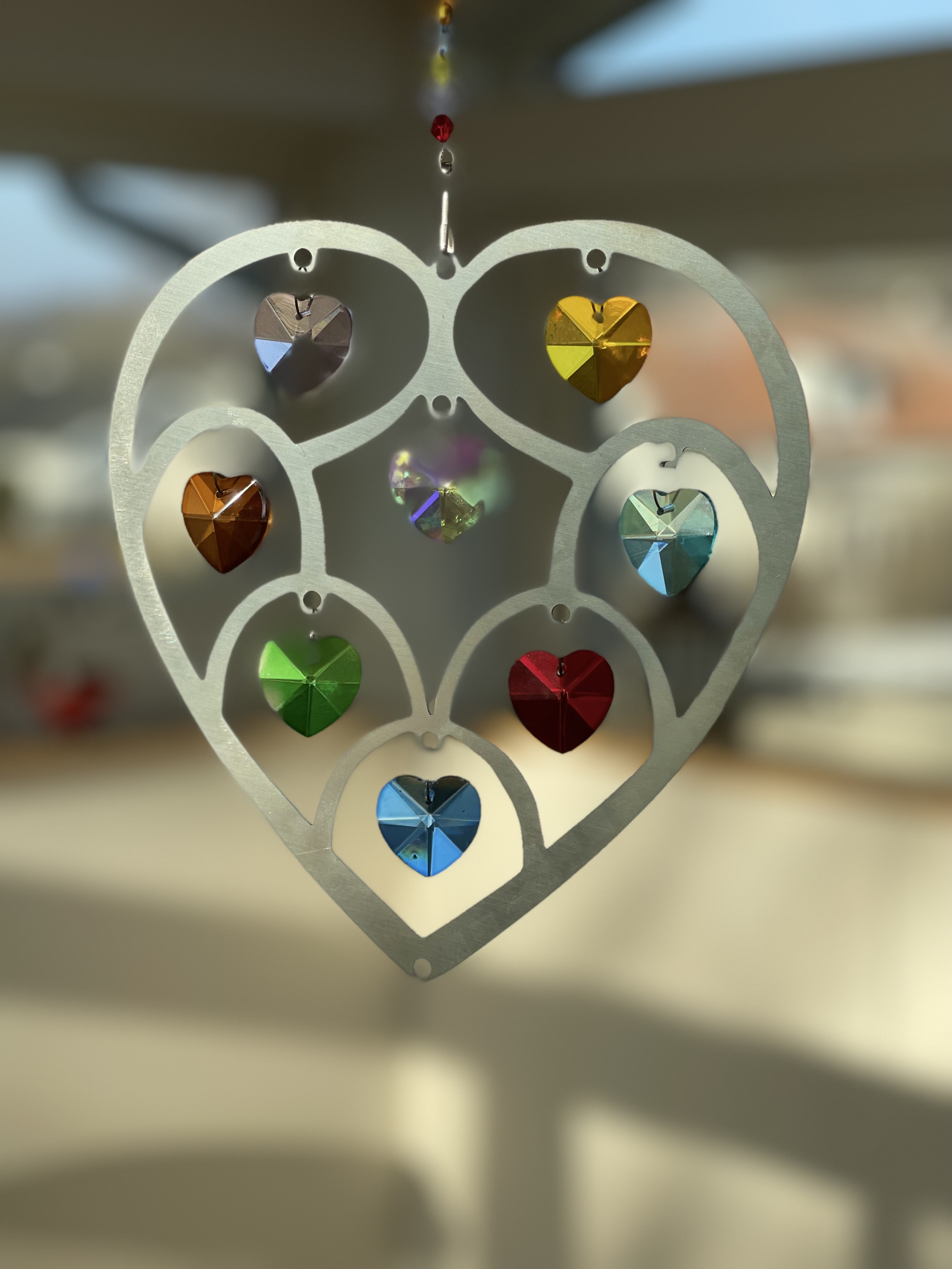 En otroligt vacker solfångare som gnistrar i solen och alla färgerna från de små glashjärtanen lyser som ädelstenar.