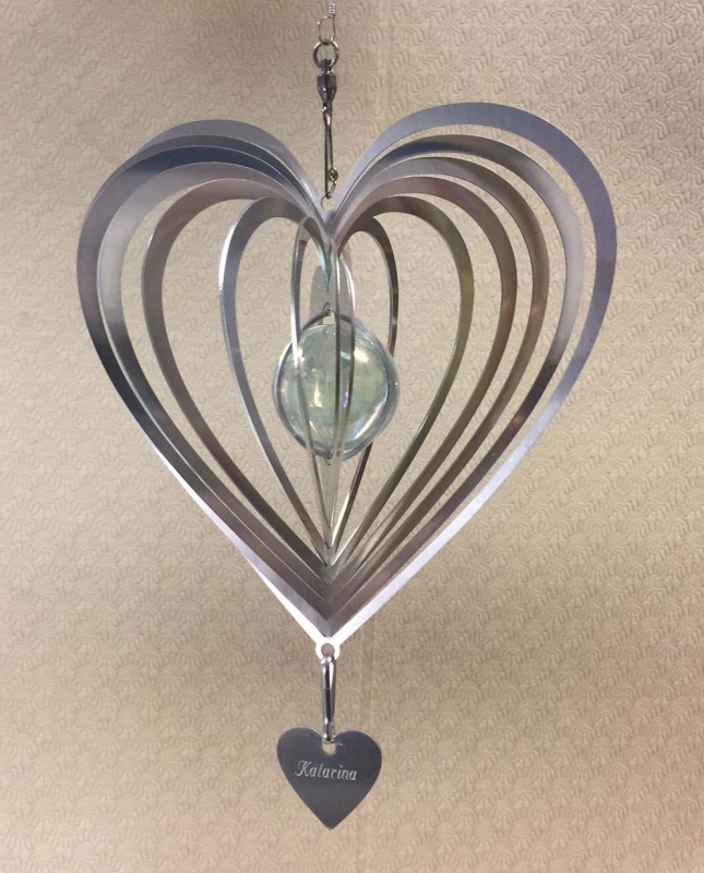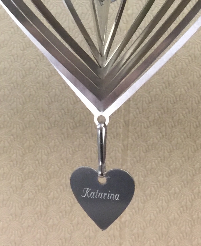 Skriv namnet eller texten du vill ha ingraverad i "meddelanderutan" i slutet på din beställning. Det lilla hjärtat kan hängas under alla vindsnurror.